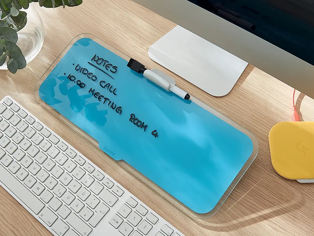 Leitz Cosy skrivebordsglastavlen til notestagning kan bruges igen og igen. Skriv med en marker til whiteboards, tør væk og start på ny.