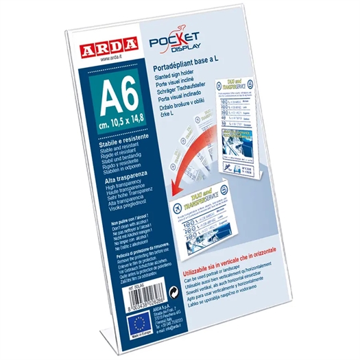 A6 Skilteholder fremstillet af miljøvenlig klar polystyren. Kan anvendes i både portræt- og landskabsformat. Stabil og modstandsdygtig. Høj gennemsigtighed.