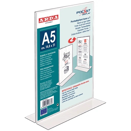 Dobbeltsidet A5 skilteholder fremstillet af miljøvenlig klar polystyren. Stabil og modstandsdygtig. Høj gennemsigtighed.